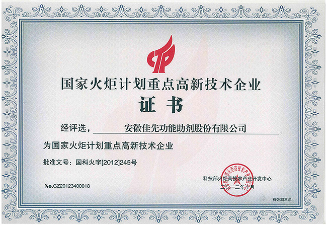 佳先股份國家火炬計劃重點高新技術企業(yè)