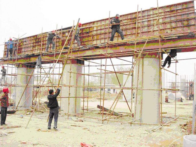 圖③ 國電配套工程之一——— G206線上跨橋建設(shè)速度加快。承擔(dān)G206線上跨橋施工建設(shè)任務(wù)的蚌埠市路橋公司積極響應(yīng),周密安排,在項目部掀起了“大干100天,確保五月底主體工程竣工”勞動競賽活動。圖為4號橋墩蓋梁模板最后檢驗時的場景。