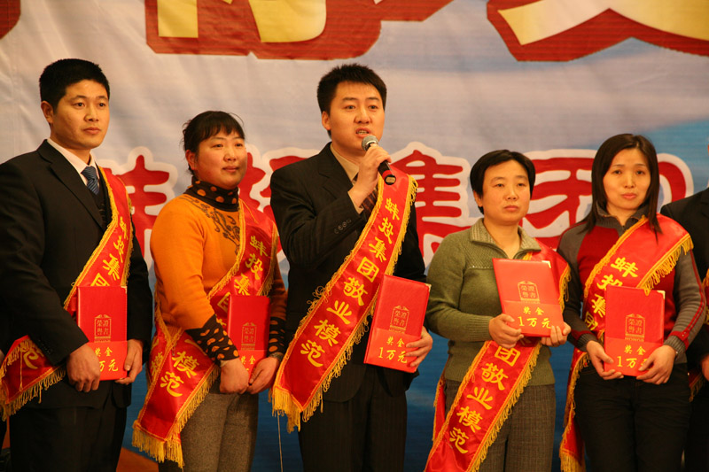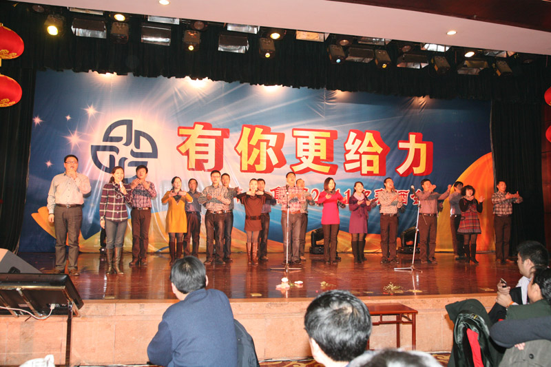 酒會上,公司表彰了2010年度6名創(chuàng)新標兵和32名敬業(yè)模范,公司領導分別為敬業(yè)模范頒發(fā)證書和獎金,張孝成副市長為創(chuàng)新標兵頒發(fā)證書、獎金并致辭,肖超秘書長、創(chuàng)新標兵及敬業(yè)模范抽出19名幸運的獲獎員工,為大家呈上了精神大餐和物質(zhì)大餐;著名喜劇表演藝術家陳佩斯領銜主演的話劇《雷人晚餐》在蚌埠大劇院隆重上演,員工們在酒會上獻出精彩紛呈的歌舞表演,為集團員工及珠城人民奉上文化大餐。與會人員舉杯同飲,共慶農(nóng)歷新年的到來。