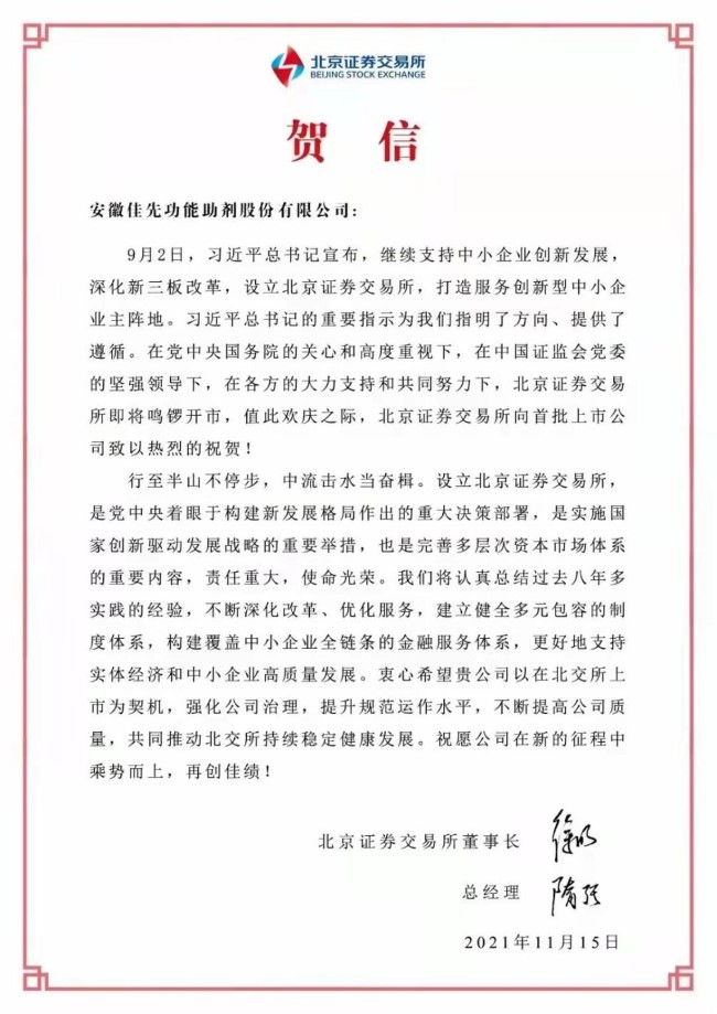 11月15日,蚌投集團旗下安徽佳先功能助劑股份有限公司正式成為全國首批北京證券交易所上市企業(yè)。北交所就佳先股份上市發(fā)來賀信。