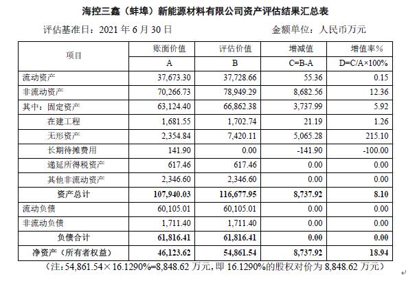 蚌埠投資集團(tuán)有限公司擬轉(zhuǎn)讓所持海控三鑫(蚌埠)新能源材料有限公司股權(quán)的行為已經(jīng)市國資委批復(fù)同意。根據(jù)國有資產(chǎn)管理及資產(chǎn)評(píng)估有關(guān)規(guī)定,現(xiàn)對(duì)所涉及的資產(chǎn)評(píng)估結(jié)果進(jìn)行公示。